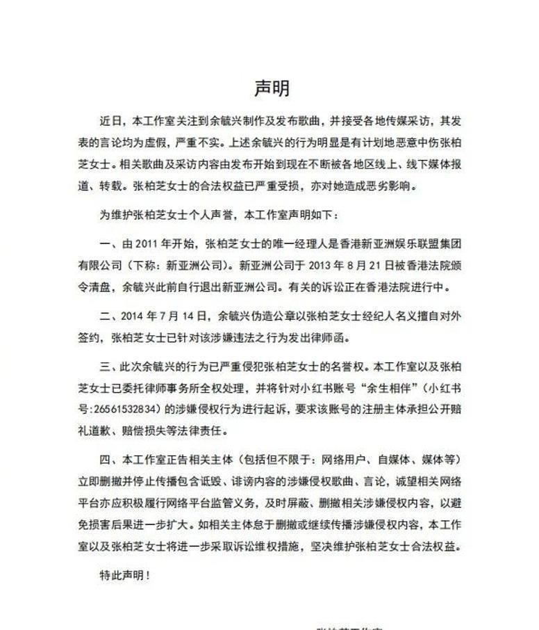 这事儿不是第一次闹了。2024年6月,余毓兴发新歌《以犬之名》,宣传时放话:“张柏芝当初为了签我,说自己‘像条狗’求同情,拿了钱就翻脸不拍戏。”当时张柏芝工作室直接发声明:全是假的!已经起诉了。还扒出2014年他就伪造过公章,冒充经纪人对外签约,当年就发过律师函。